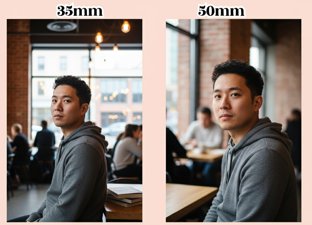 Shooting in constrained spaces: You can shoot in a café, a small room, or a narrow street without having to step back to the wall like you often do with a 50 mm lens.